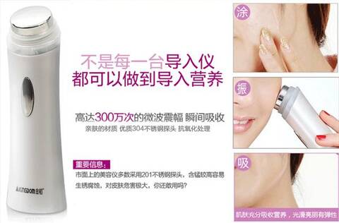 对于经常护肤的MM一定知道,护肤品里大部份的有效成份是有机大分子,在自然状态下难以穿透人体的天然屏——表皮,而我们平常用手简单的涂抹,营养只能敷在皮肤表面,营养进不去,再好的护肤品也发挥不了作用。而金稻S611可以通过按摩、产生温热等手段,将护肤品的营养物质深入皮肤真皮层,让皮肤吸收到更多营养。 借助这小小超声波仪器,皮肤就可以得到了不起精心照顾,好简单!可以自己在家使用,促进皮肤本身的血液循环,改善肤质及肤色.也可配合眼霜、按摩霜、洗面奶对肌肤进行深层保养,让护肤品发挥更好的效果。营养吸收好了,粉刺、皱纹等皮肤问题迎刃而解。你的肌肤自然会呈现更加晶莹透亮、幼嫩光滑的健康美态。